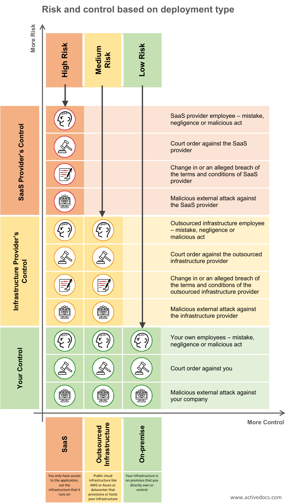 Let’s look closer at who can "pull the plug". The risk is cumulative. For example, if you’re using a SaaS application, then both the risks under your control and the risks under the infrastructure provider’s control need to be accounted for in the SaaS category.