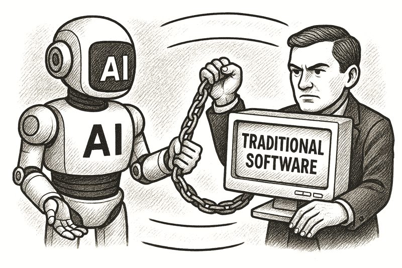 The future likely involves a symbiotic relationship. Traditional software can serve as AI's deterministic "slave" for specific tasks. Conversely, it can act as the "master," orchestrating and comparing outputs from multiple AI systems for reliable, high-quality results.